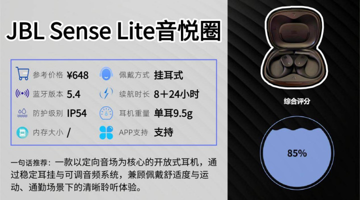 JBL在音频阛阓属于老牌品牌,以音质平衡、耐用和易用性着名。Sense Lite音悦圈在JBL家具线中定位为轻量闲适的洞开式默契耳机,更偏向跑步和日常默契使用,兼顾率领舒截止与稳固性,而不是强调高端发热音质。