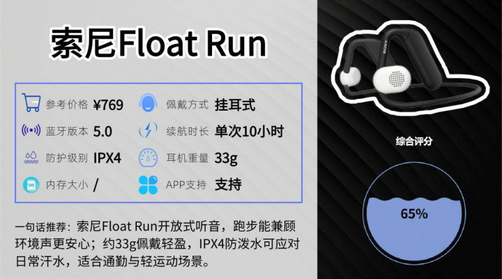适合跑步、健身、散布及通勤等轻中度默契,IPX4防水可叮嘱汗水和小雨。洞开式规画让环境声露出感知,提高户外默契安全。耳机营救免提通话,日常办公或默契中可放纵接听。举座率领稳固,动作幅度大时不易滑落,默契使用体验精致。抽象来看,索尼Float Run以轻量闲适、洞开式听音、安全感强和浅易通话为亮点,是注目环境声感知和日常轻中度默契的用户的优选耳机。